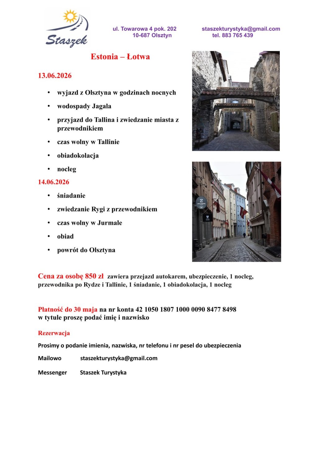 Cena za osobę 850 zł zawiera przejazd autokarem, ubezpieczenie, 1 nocleg, przewodnika po Rydze i Tallinie, 1 śniadanie, 1 obiadokolacja, 1 nocleg