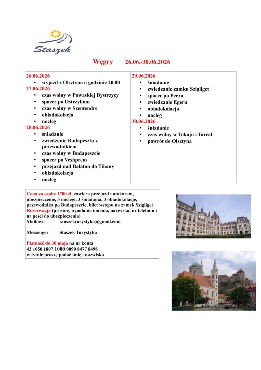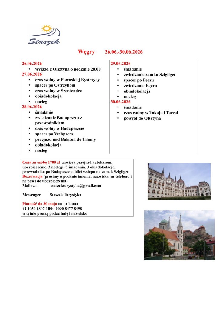 | 29.06.2026 śniadanie zwiedzanie zamku Szigliget spacer po Peczu zwiedzanie Egeru obiadokolacja nocleg 30.06.2026 śniadanie czas wolny w Tokaju i Tarcal powrót do Olsztyna Cena za osobę 1700 zł zawiera przejazd autokarem, ubezpieczenie, 3 noclegi, 3 śniadania, 3 obiadokolacje, przewodnika po Budapeszcie, bilet wstępu na zamek Szigliget Rezerwacja (prosimy o podanie imienia, nazwiska, nr telefonu i nr pesel do ubezpieczenia) Mailowo staszekturystyka@gmail.com Messenger Staszek Turystyka Płatność do 30 maja na nr konta 42 1050 1807 1000 0090 8477 8498 w tytule proszę podać imię i nazwisko |
