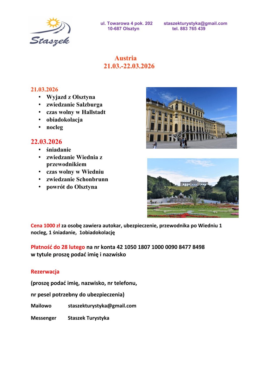Cena 1000 zł za osobę zawiera autokar, ubezpieczenie, przewodnika po Wiedniu 1 nocleg, 1 śniadanie, 1obiadokolację