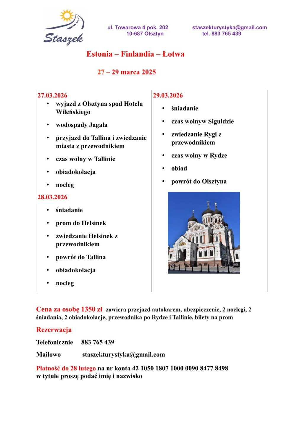 Cena za osobę 1350 zł zawiera przejazd autokarem, ubezpieczenie, 2 noclegi, 2 śniadania, 2 obiadokolacje, przewodnika po Rydze i Tallinie, bilety na prom
