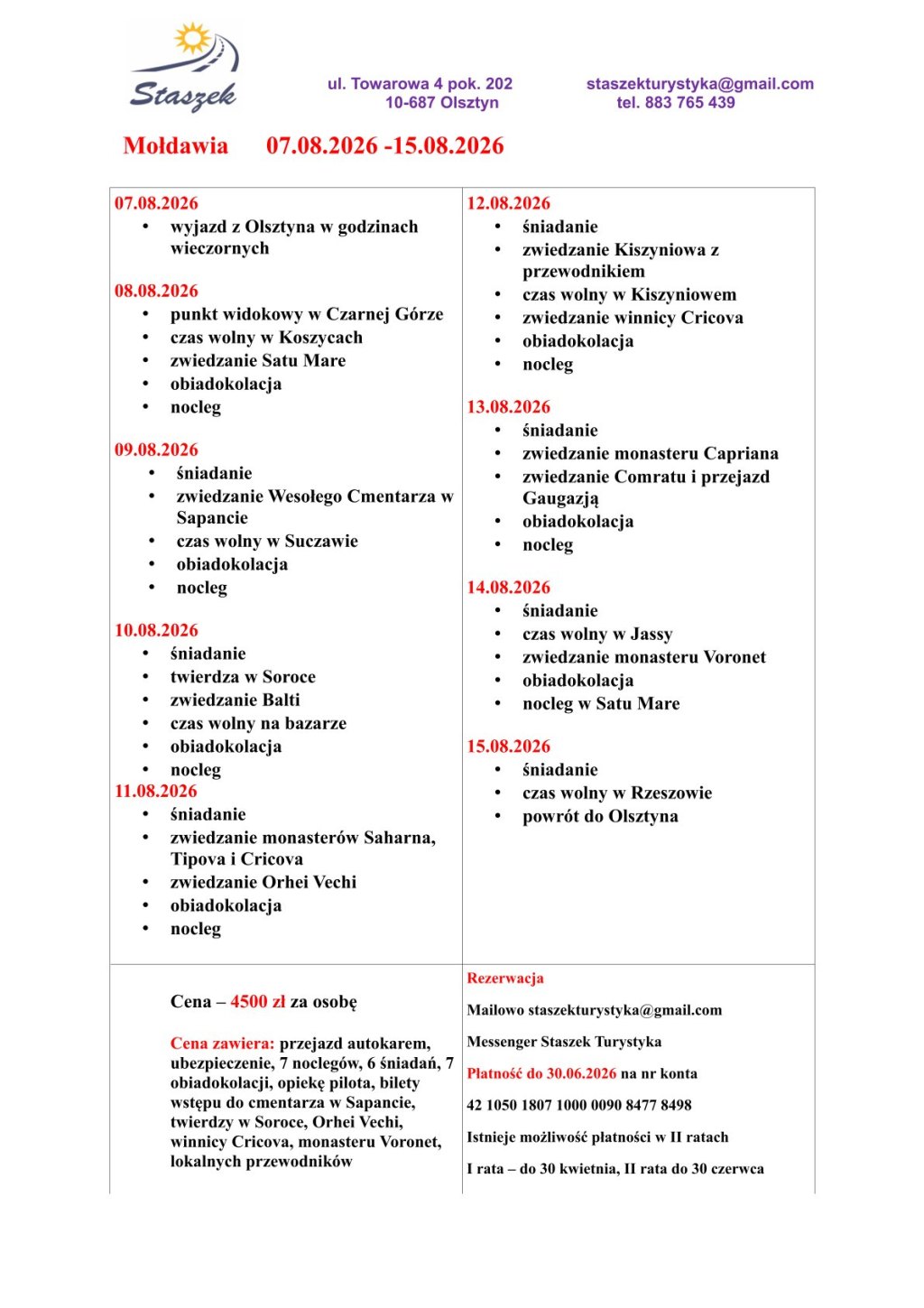 | 12.08.2026 * śniadanie * zwiedzanie Kiszyniowa z przewodnikiem * czas wolny w Kiszyniowem * zwiedzanie winnicy Cricova * obiadokolacja * nocleg 13.08.2026 * śniadanie * zwiedzanie monasteru Capriana * zwiedzanie Comratu i przejazd Gaugazją * obiadokolacja * nocleg 14.08.2026 * śniadanie * czas wolny w Jassy * zwiedzanie monasteru Voronet * obiadokolacja * nocleg w Satu Mare 15.08.2026 * śniadanieczas wolny w Rzeszowie * powrót do Olsztyna Cena – 4500 zł za osobę Cena zawiera: przejazd autokarem, ubezpieczenie, 7 noclegów, 6 śniadań, 7 obiadokolacji, opiekę pilota, bilety wstępu do cmentarza w Sapancie, twierdzy w Soroce, Orhei Vechi, winnicy Cricova, monasteru Voronet, lokalnych przewodników Rezerwacja Mailowo staszekturystyka@gmail.com Messenger Staszek Turystyka Płatność do 30.06.2026 na nr konta42 1050 1807 1000 0090 8477 8498 Istnieje możliwość płatności w II ratach I rata – do 30 kwietnia, II rata do 30 czerwca |
