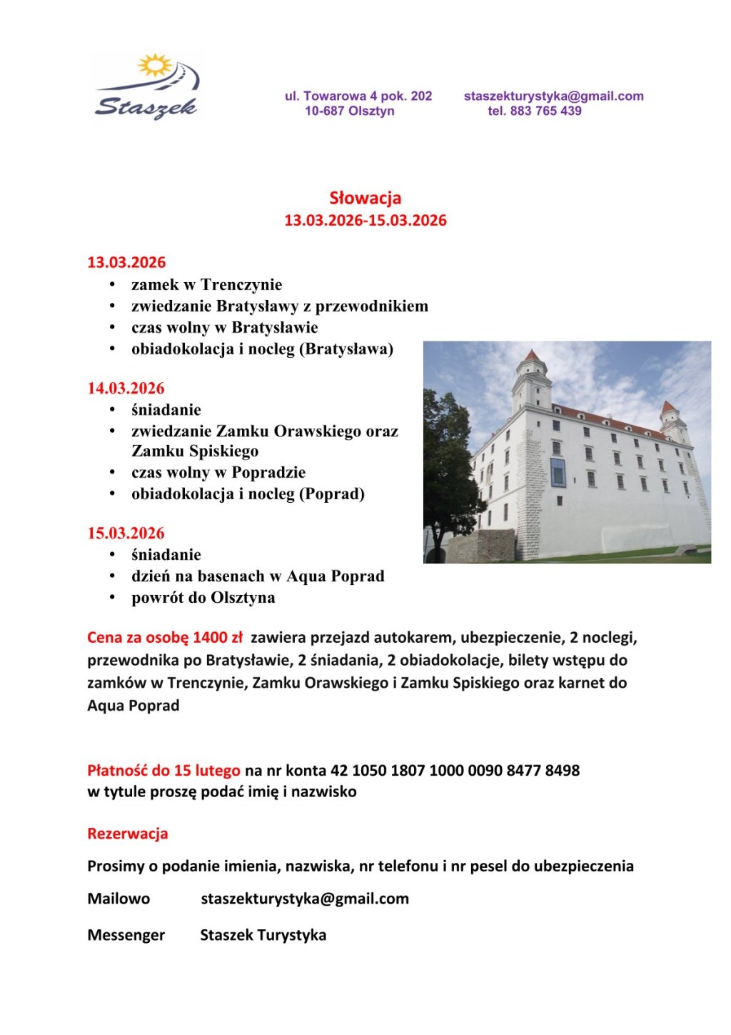 Cena za osobę 1400 zł zawiera przejazd autokarem, ubezpieczenie, 2 noclegi, przewodnika po Bratysławie, 2 śniadania, 2 obiadokolacje, bilety wstępu do zamków w Trenczynie, Zamku Orawskiego i Zamku Spiskiego oraz karnet do Aqua Poprad